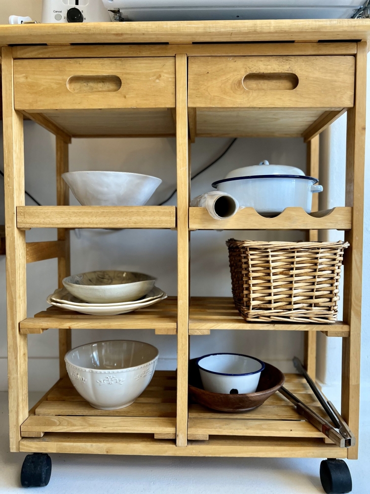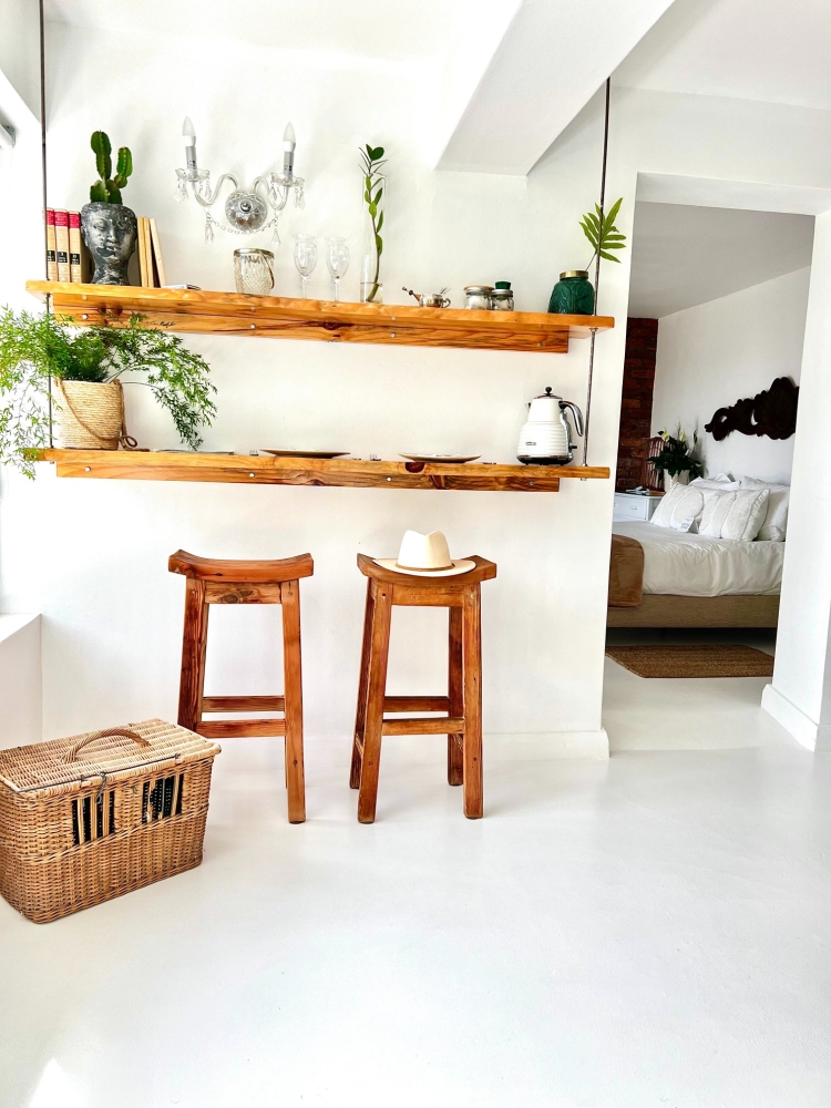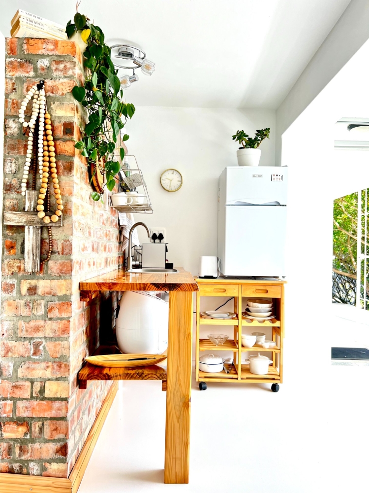 The living area features an open-plan design with a fully equipped kitchenette including a microwave, bar fridge, air-fryer, kettle, cutlery, and crockery. The lounge is furnished with comfortable seating.