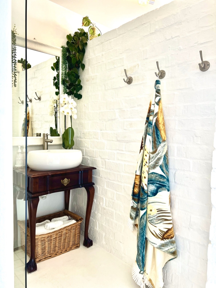 The unit opens onto a rose garden with never-ending sea views, including a braai area and nook under the old Frangipani tree. Secure parking is available on the premises