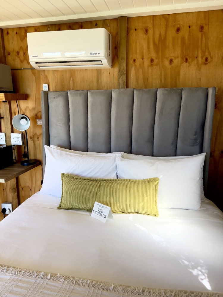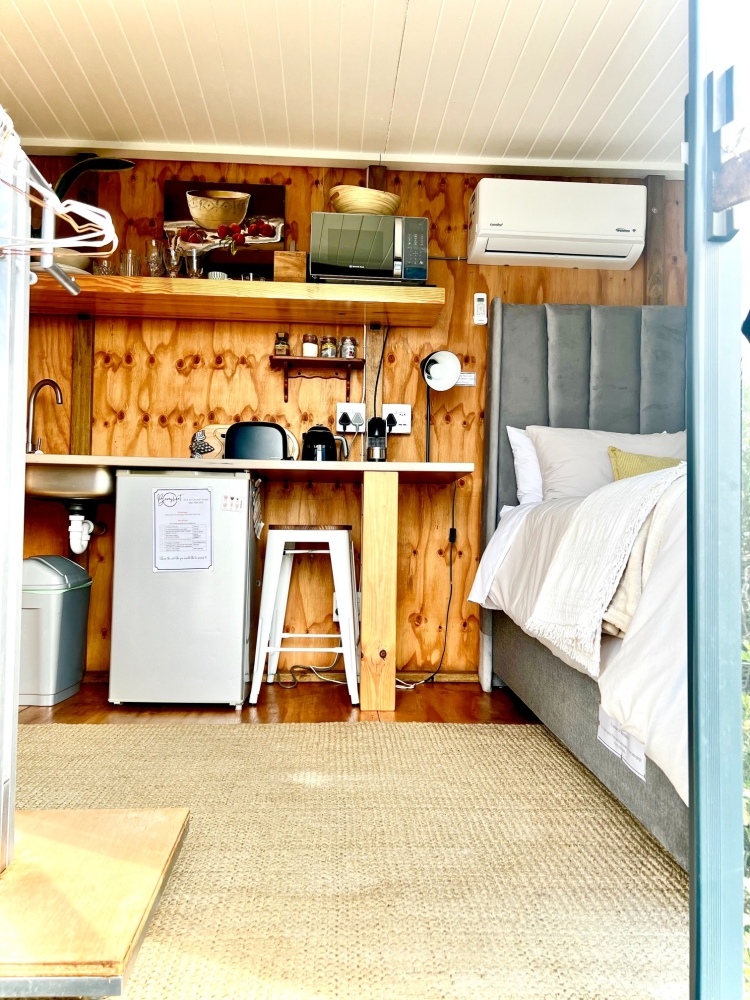 The living area features an open-plan design with a fully equipped kitchenette including a microwave, bar fridge, air-fryer, kettle, toaster, cutlery, and crockery.