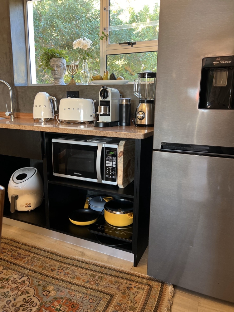 Beautifully furnished with chandeliers, velvet, and Persian carpets, the living area features an open-plan design with a fully equipped kitchen including a microwave, fridge-freezer, coffee machine, toaster, kettle, air-fryer, cutlery, and crockery. Also available in the kitchen is a 4-seater dining table perfect for meals. The lounge is furnished with comfortable seating, a TV with Netflix along with free Wi-Fi facilities, and a fireplace for colder nights.