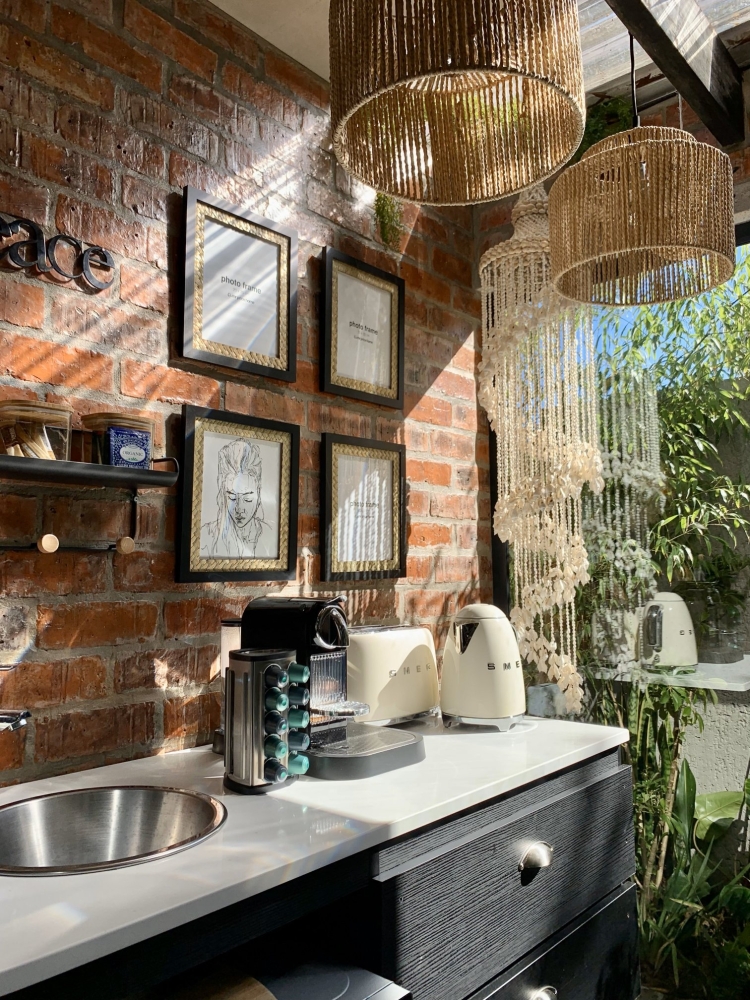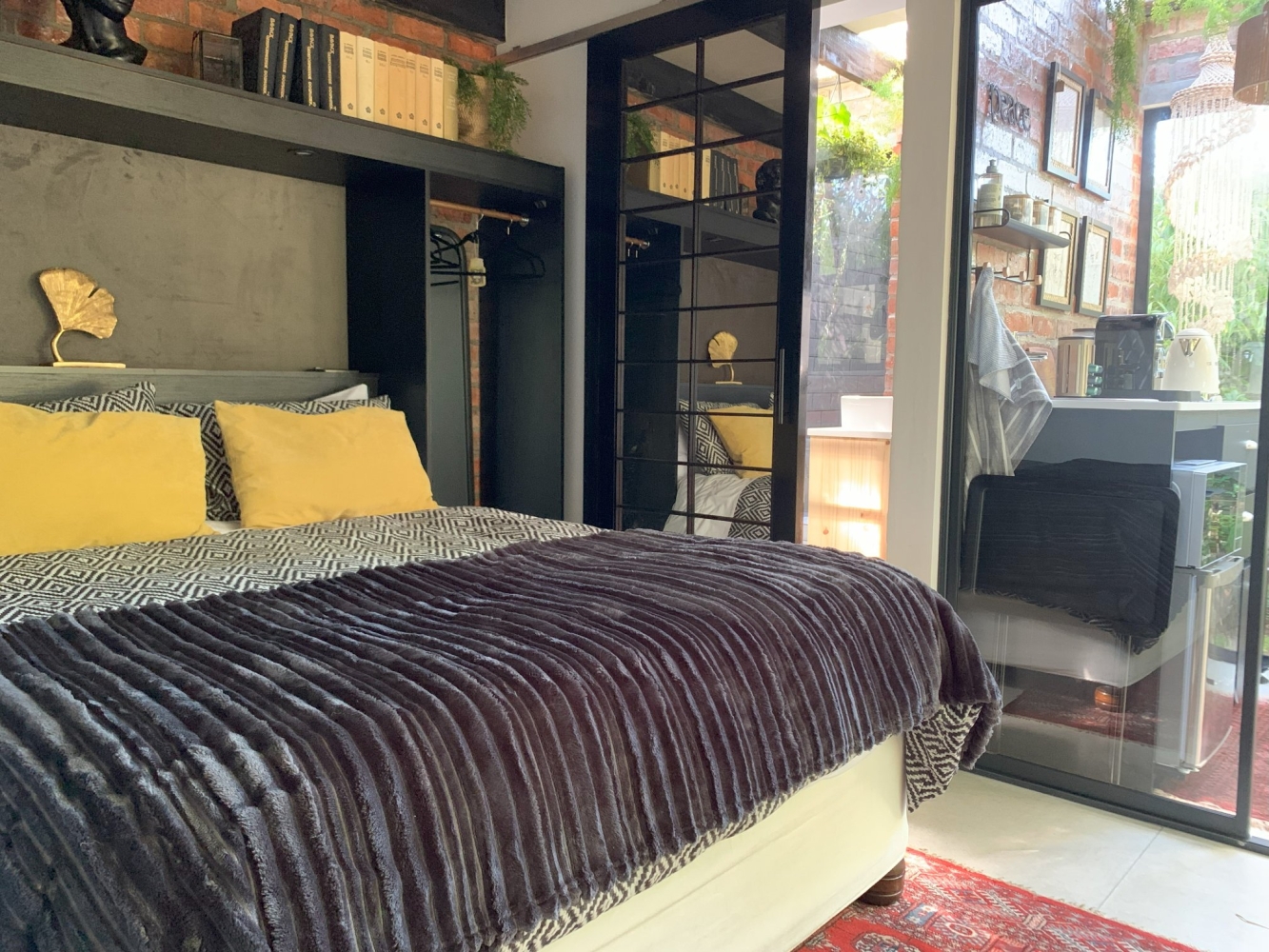 The living area features an open-plan design with a fully equipped kitchenette including a microwave, bar fridge, air-fryer, kettle, toaster, Nespresso machine, cutlery, and crockery.