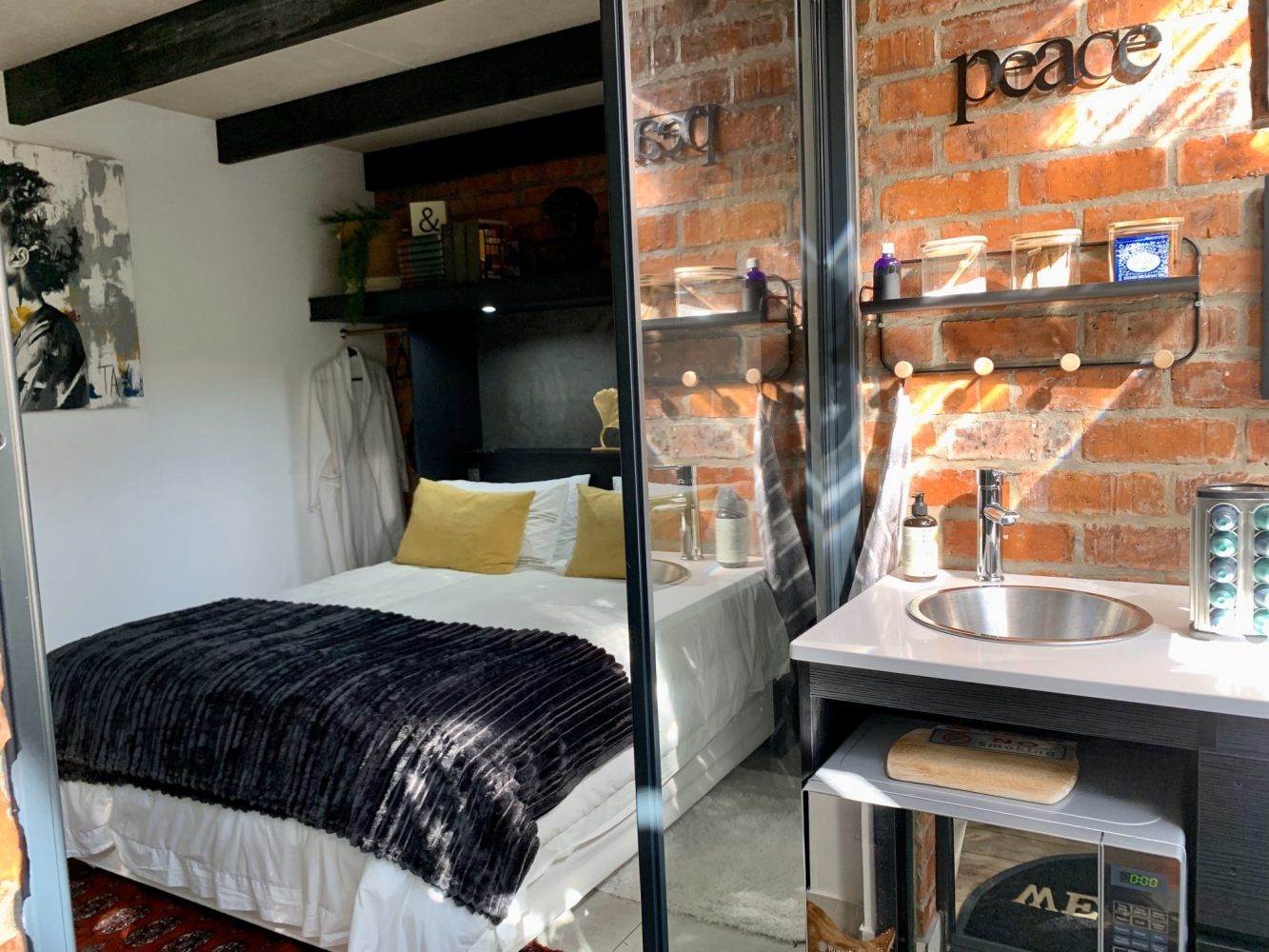 The living area features an open-plan design with a fully equipped kitchenette including a microwave, bar fridge, air-fryer, kettle, toaster, Nespresso machine, cutlery, and crockery.